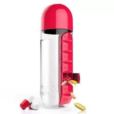2-i-1 Vattenflaska med Medicindosett – Smart Flaska med Inbyggd Pillerask (7 Dagar) för Resa & Träning