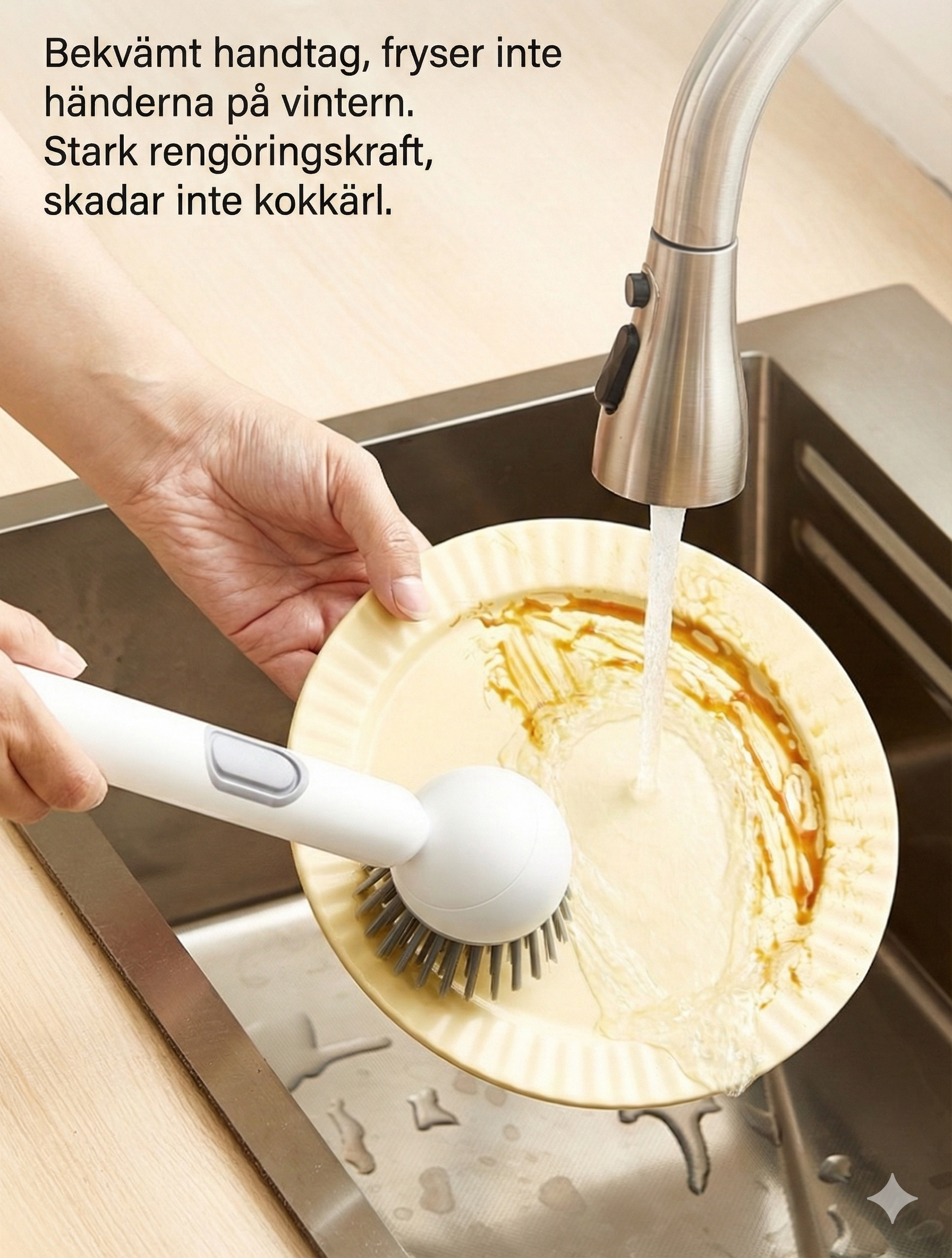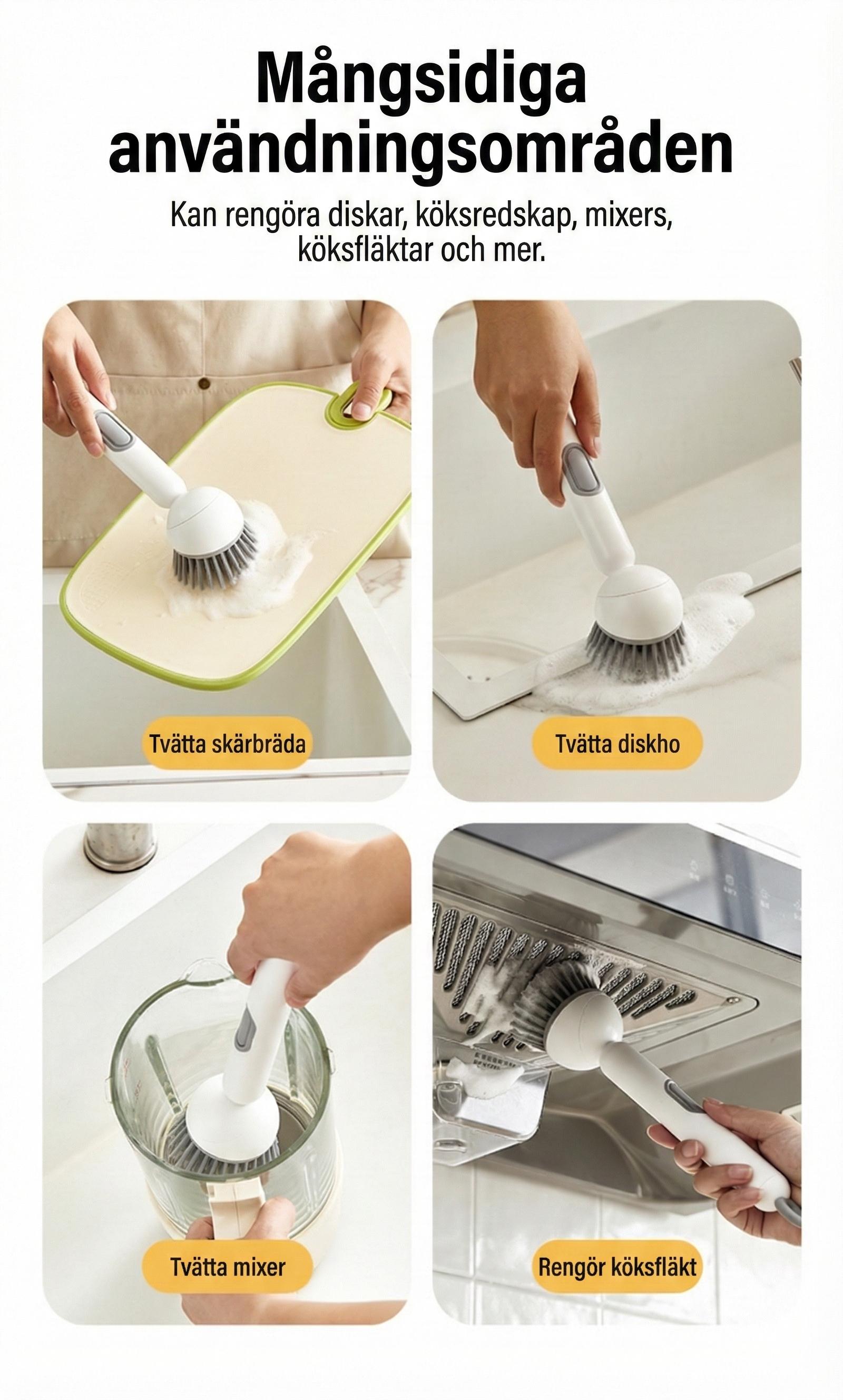 Ergonomisk design som skyddar händerna och sparar kraft Slipp kontakt med smutsigt diskvatten och starka rengöringsmedel. Det ergonomiska och roterande handtaget är utformat för att vara arbetsbesparande, vilket minskar ansträngningen för handleden när du diskar. Genom att hålla händerna torra och rena ser denna borste till att arbetet blir bekvämt och inte skadar händerna, vilket gör den dagliga disken betydligt trevligare.