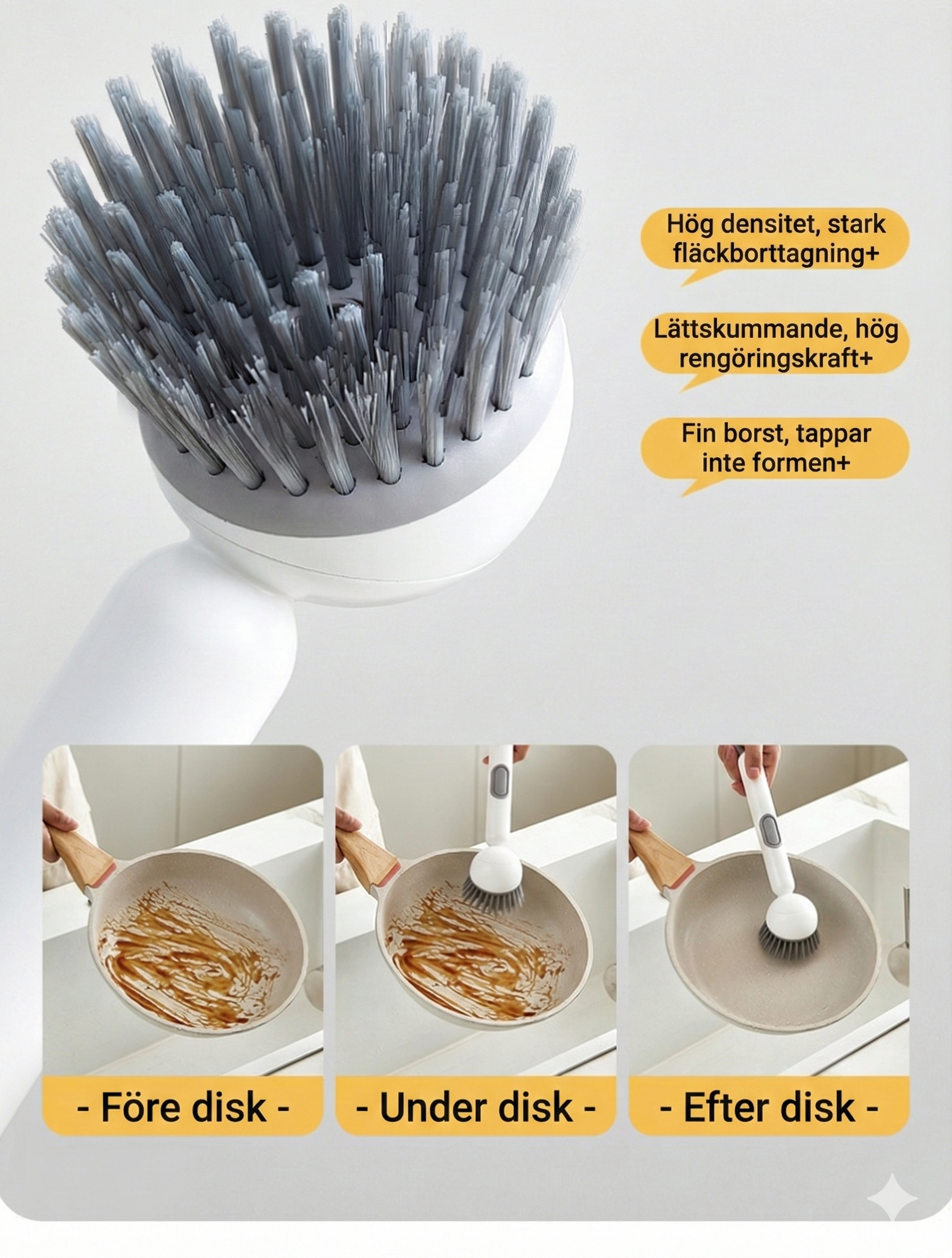 Skonsam mot beläggningar och känsliga ytor Du behöver inte oroa dig för repor i dina favoritpannor. Borsthuvudet har täta borststrån som är effektiva mot smuts men samtidigt skonsamma nog att inte skada beläggningen på non-stick-kärl och grytor. Detta gör borsten till ett säkert och pålitligt redskap för att vårda dina köksredskap samtidigt som de blir skinande rena.
