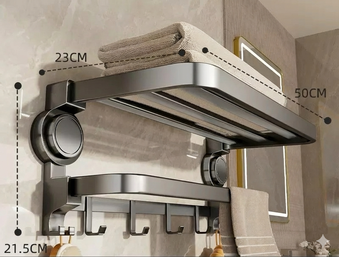 Maximera utrymmet med en smart, vikbar design Har du ett litet badrum? Inga problem. Denna uppgraderade badrumshylla är den ultimata utrymmesräddaren. Tack vare den geniala vikbara konstruktionen kan du enkelt fälla upp hyllan mot väggen när den inte används, vilket frigör värdefull plats direkt. Det är en smidig lösning som ger dig generöst med utrymme för handdukar och toalettartiklar när du behöver det, och ett luftigt badrum när du inte gör det.