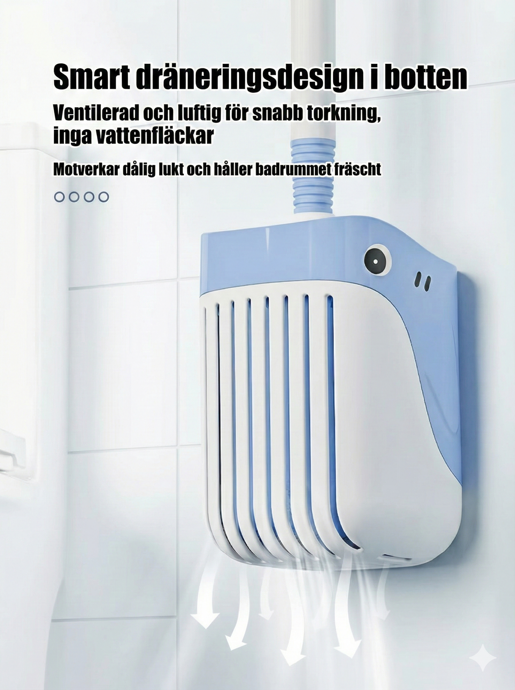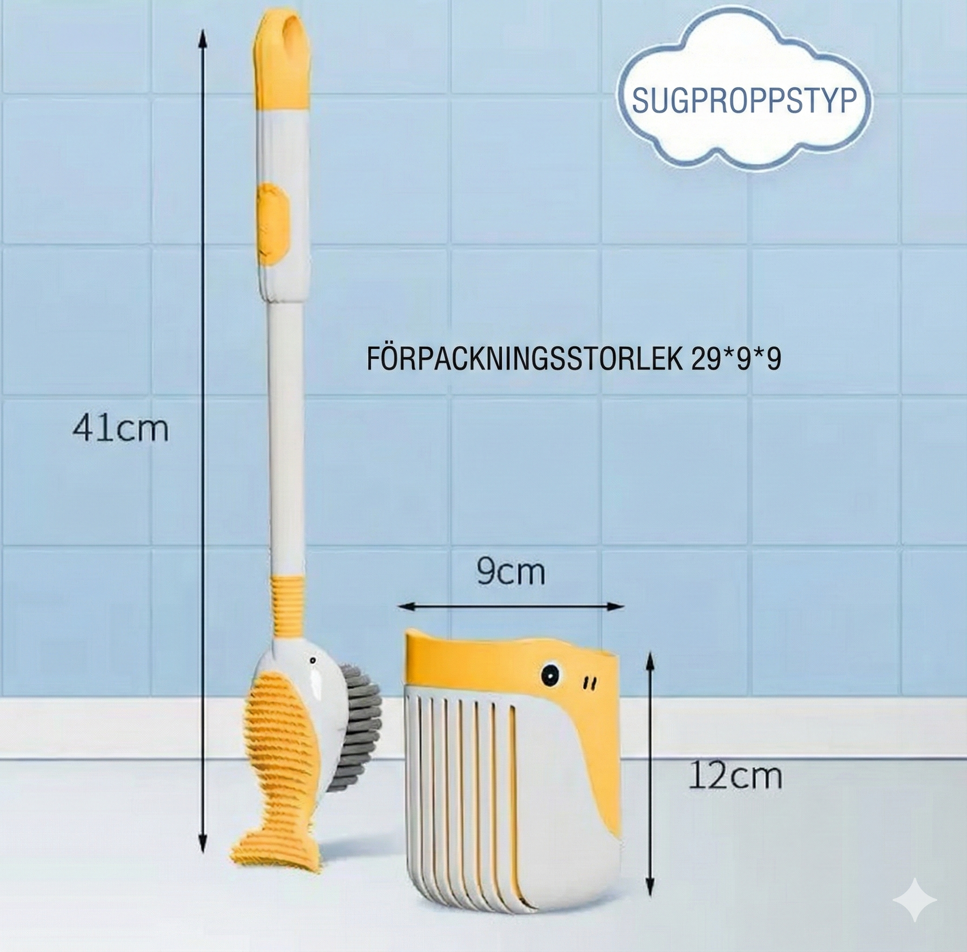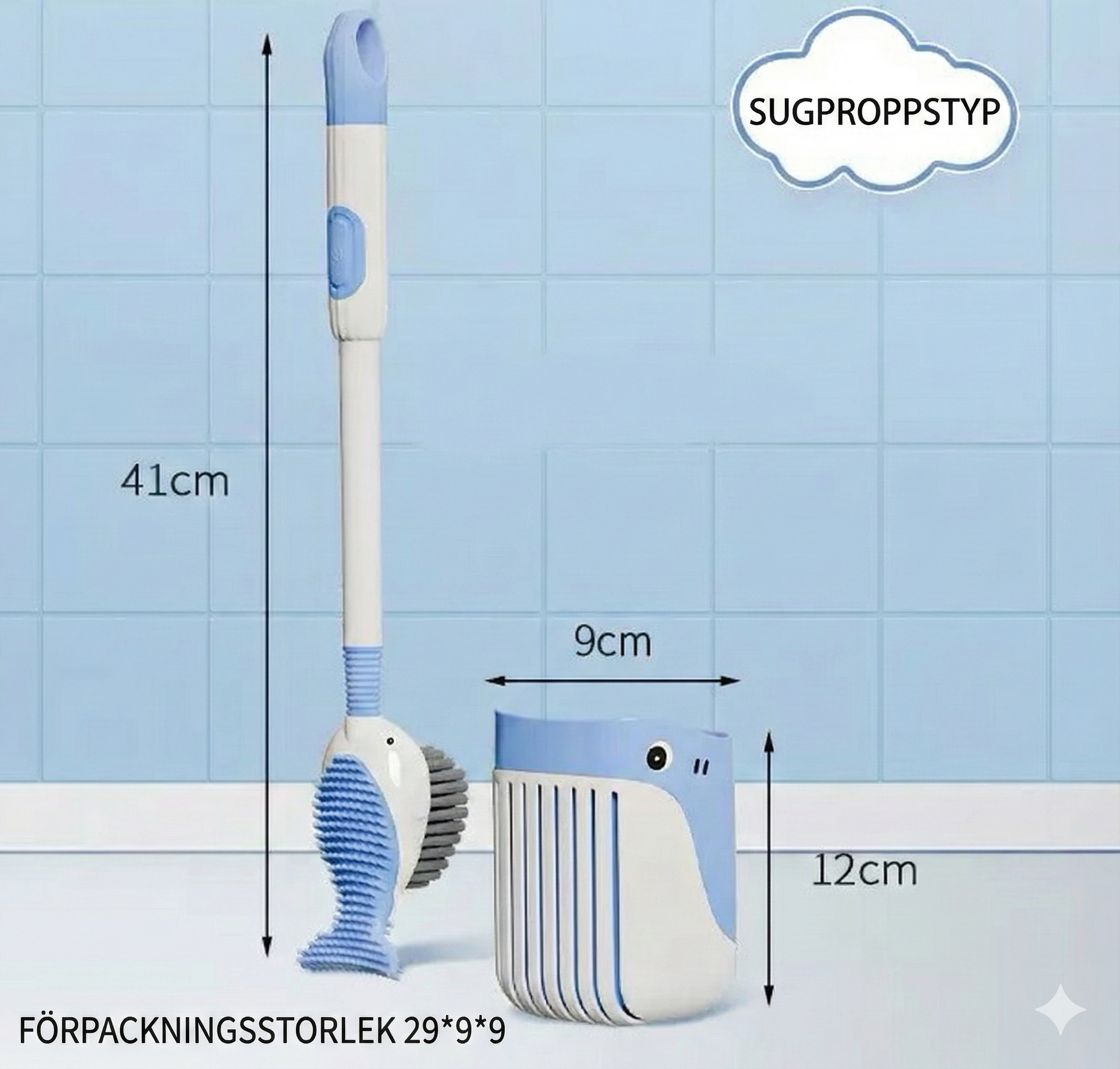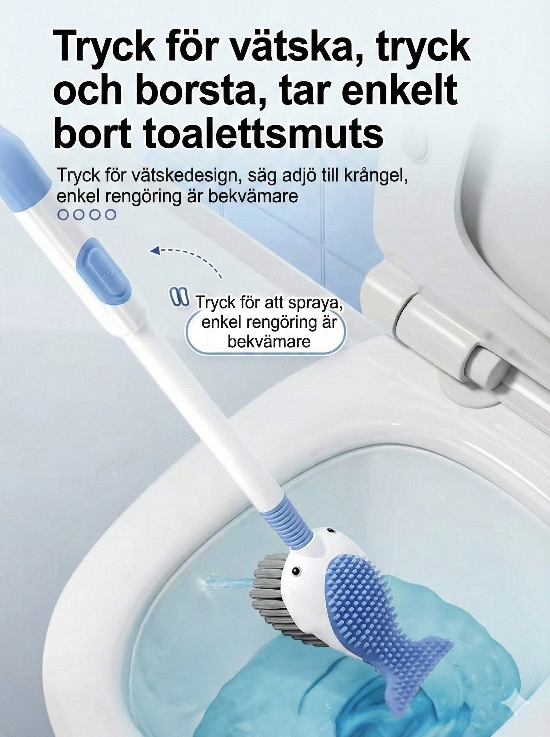 Charmig valformad design med inbyggd sprayfunktion Liva upp badrumsinredningen med denna unika valformade toalettborste. Den har en lekfull tecknad design som döljer en mycket praktisk funktion. Tack vare den smarta spraydesignen kan du enkelt trycka ut rengöringsmedel direkt från handtaget medan du borstar, vilket eliminerar behovet av separata flaskor och gör städningen smidigare.